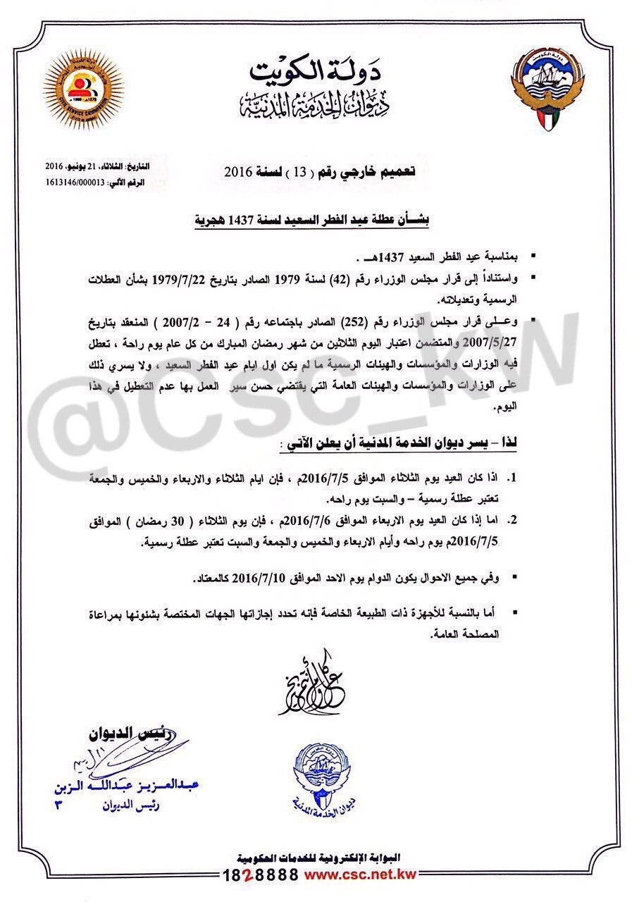 Kuwaitnews كويت نيوز On Twitter الخدمة المدنية اذا كان عيد الفطر الثلاثاء 5 يوليو أو الأربعاء 6 يوليو فان الدوام الرسمي بكل الأحوال الأحد 10 يوليو