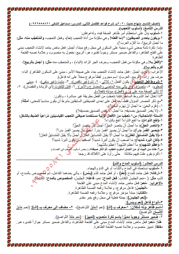 شرح قواعد اللغة العربية للصف التاسع الفصل الثاني 2019 2020 واوراق عمل شاملة